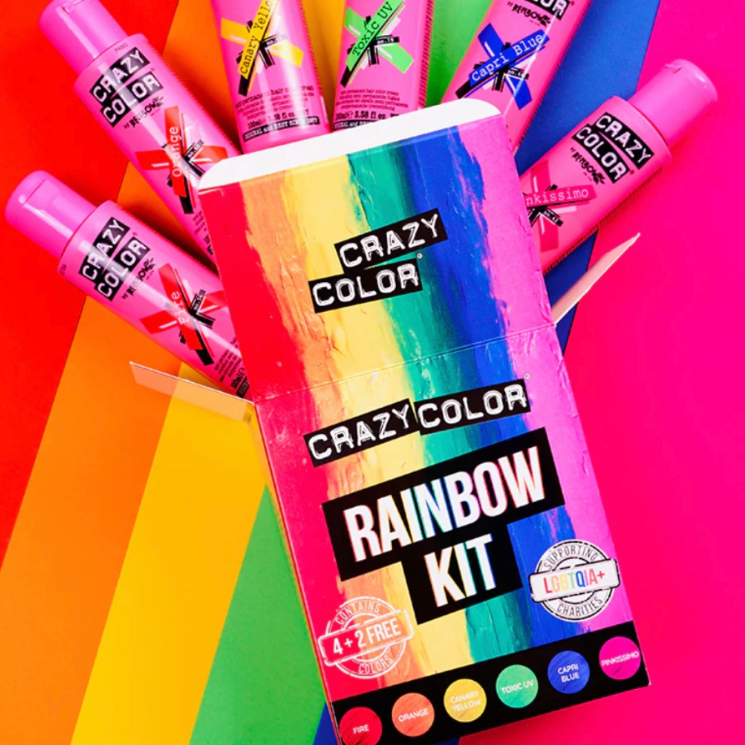 Unleash your creative side with the CRAZY COLOR Rainbow Kit. Designed to help you push boundaries and create the ultimate rainbow look, this kit celebrates being unapologetically you. The Rainbow Kit includes six top-selling shades: Fire, Orange, Canary Yellow, Toxic UV, Capri Blue, and Pinkissimo. Not only do you get every color needed to craft a stunning rainbow look, but two of these vibrant shades are completely free, allowing you to experiment and express your individuality even more. With the CRAZY COLOR® Rainbow Kit, you have everything you need to push those creative boundaries and create the ultimate rainbow look.