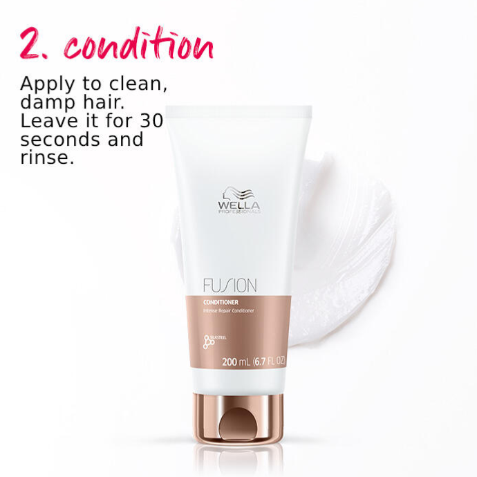 - Condition the hair by applying the Fusion conditioner to clean damp hair. Leave it for 30 seconds and rinse.